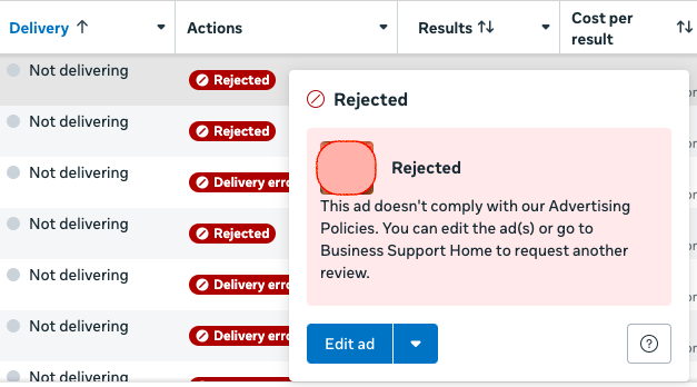 مدير الإعلانات ثم اختر الإعلان المرفوض ثم عمود التسليم (سيظهر باللون الأحمر: مرفوض) ثم عرض التفاصيل